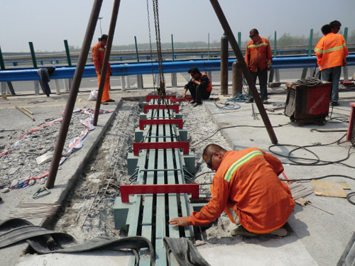 2.施工單位在公路橋梁上安裝模數(shù)式橋梁伸縮縫,一旦發(fā)生碰撞變形,很難修復(fù)為合格產(chǎn)品,所以在安裝的全過程中,一定要采取措施保護(hù),嚴(yán)禁任何車輛通過。如果現(xiàn)場出現(xiàn)伸縮縫的伸縮量不易調(diào)整,所以對成品檢查一定要認(rèn)真、仔細(xì)。不合格不可運(yùn)至現(xiàn)場。
